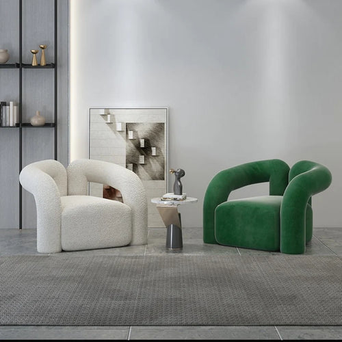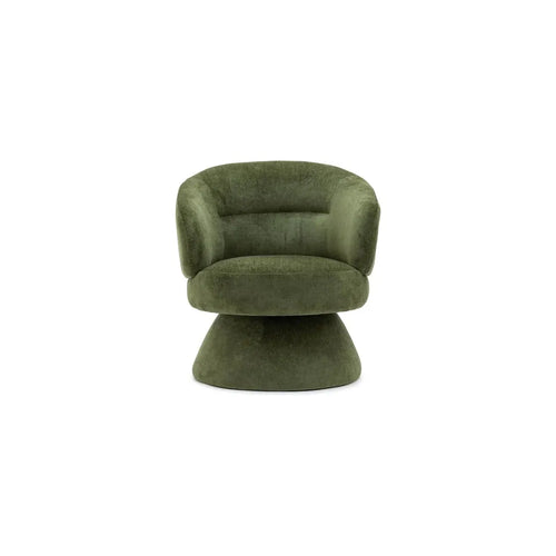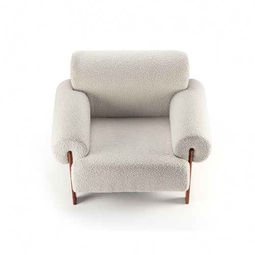 Straight-on image of Aveline Armchair emphasizing modern curved shape and inviting aesthetic