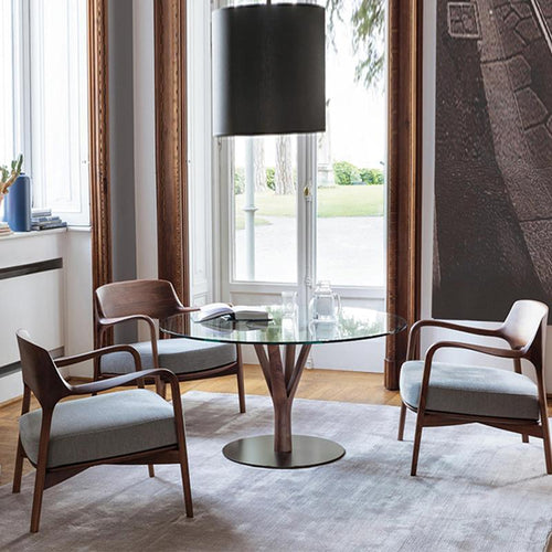 Angled view of Jong Lounge Chair highlighting curved arms, upholstered seat