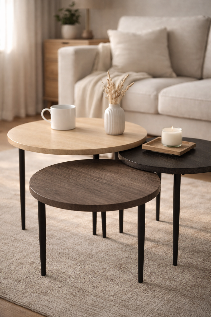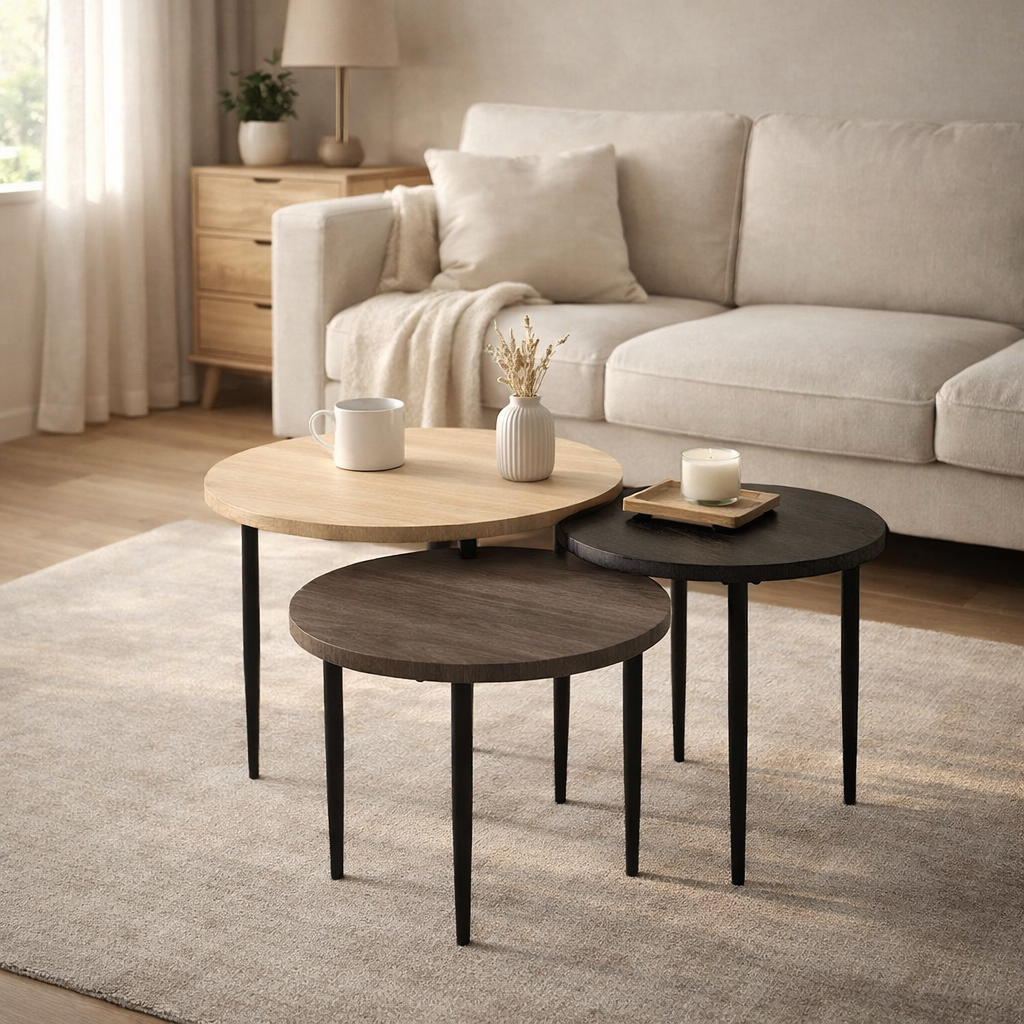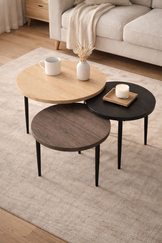 The Valeno Set of 3 Coffee Tables is a stylish and functional furniture set that typically includes three tables of varying sizes and colors, designed to be used together or separately in a living room or other spaces. The set offers versatility, as the smaller tables can be used as accent pieces or for different purposes, while the larger table serves as the central focal point. Often made from materials like wood, metal, or glass, these tables feature a modern or contemporary design with sleek lines and an elegant finish. The set is ideal for creating a coordinated look while maximizing surface area for decor, drinks, or other essentials.