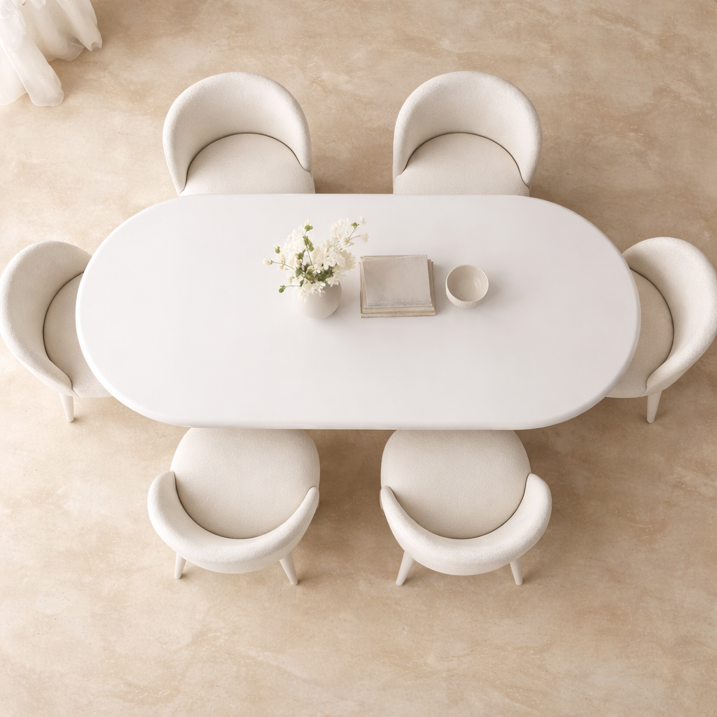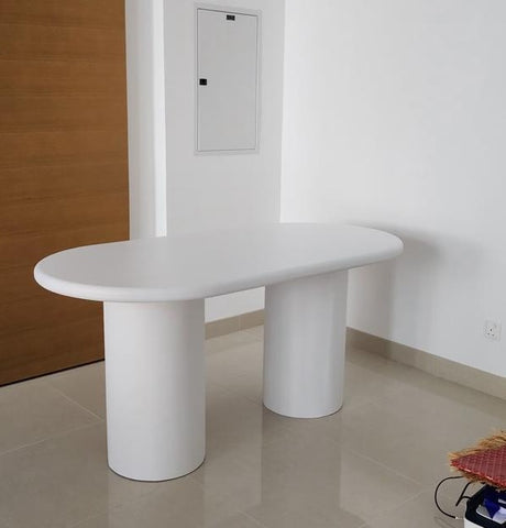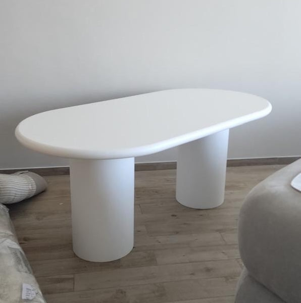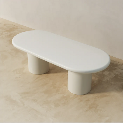 The Gordon Dining Table features a sleek capsule-shaped top supported by two cylindrical pedestal legs, creating a clean architectural profile that suits both modern and contemporary interiors. The elongated surface with rounded ends blends sculptural form and everyday function, offering a soft yet structured look. Made from high-quality engineered wood with a matte lacquer finish, the Gordon is handcrafted to order and available in five sizesβideal for open dining spaces, studio apartments, and majlis seating arrangements.