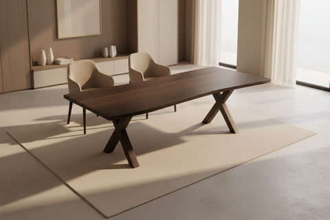 The Neolle Silva Dining Table is a sculptural statement made for modern interiors, featuring a Rectangular-shaped top with flowing concave edges and bold X-frame pedestal legs. Built from solid wood and finished in a rich dark tone, it evokes the strength of industrial form paired with refined artisanal craftsmanship. The silhouette delivers both structural balance and visual movement โ a perfect fit for dining rooms that appreciate functional art. Made to order in the UAE and available in five sizes.