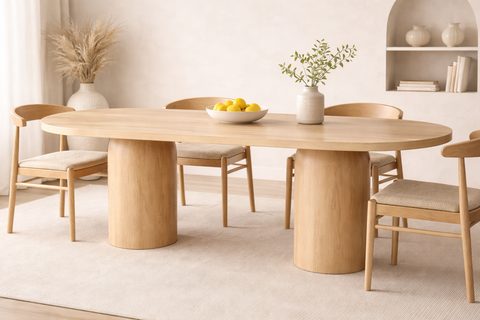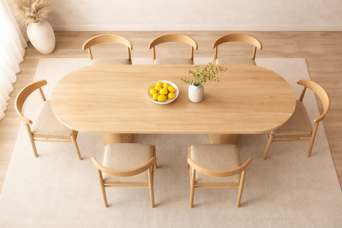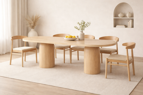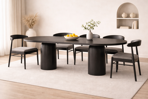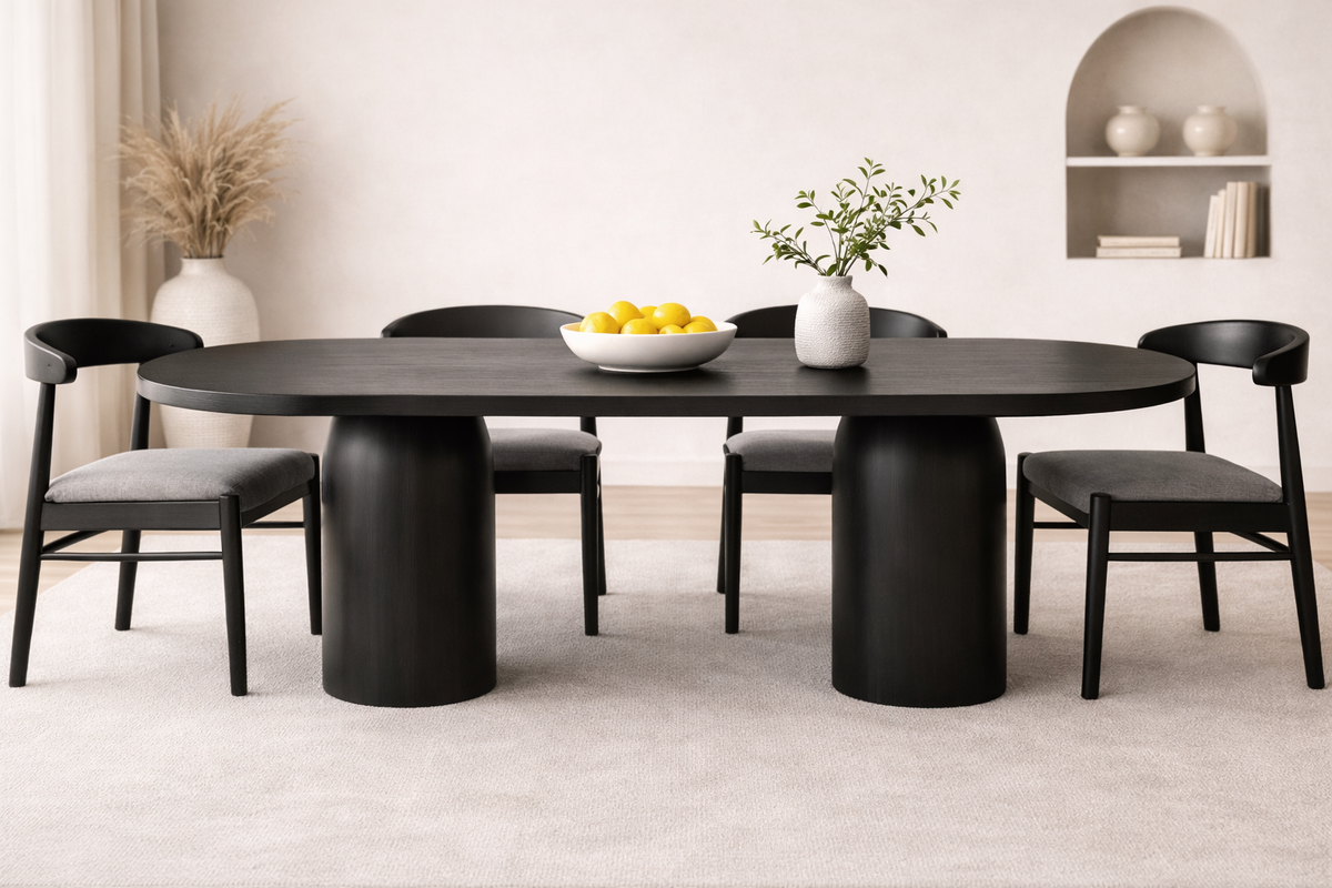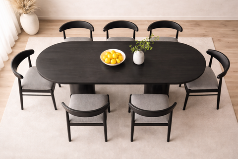 The Zenon Dining Table is a sculptural centerpiece that combines architectural elegance with natural materials. Its Capsule-Shaped top rests on two cylindrical column legs, each crowned with a dome-like cap that seamlessly blends into the underside of the tabletop—creating a floating architectural effect. Crafted from solid wood with an ash veneer finish, the Zenon is available in black or natural wood tones and made to order in five versatile sizes. Ideal for open-plan living, majlis seating, or contemporary interiors, this piece balances bold geometry with subtle detailing.