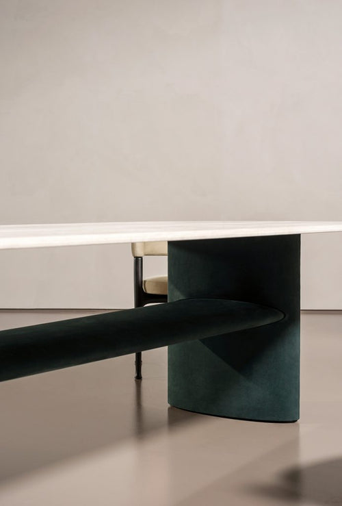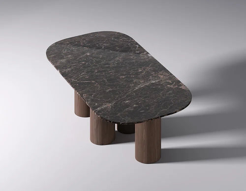 Marina marble capsule dining table with four cylindrical walnut base legs"