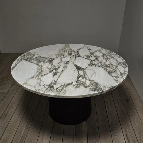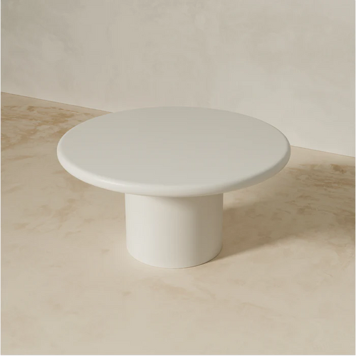Liebe round dining table with cylindrical pedestal base in matte off-white finish