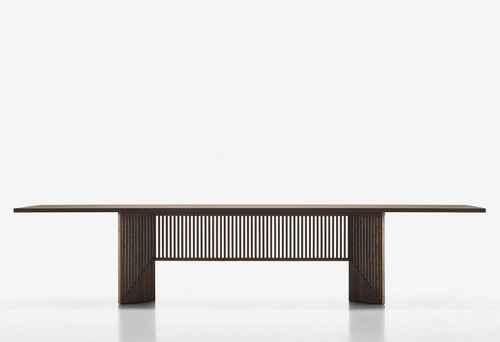 Ace rectangular dining table with slatted architectural black oak base and minimalist chair
