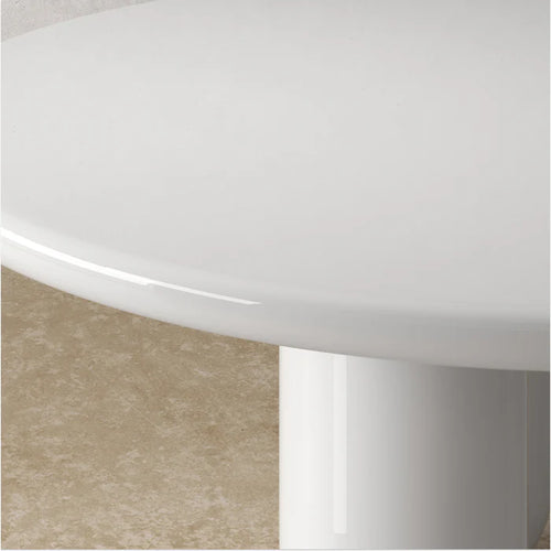 Front view of Finral round dining table with high-gloss white finish and sculptural cylinder legs