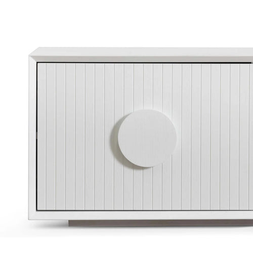 Straight-on image of Mimosa Storage Cabinet emphasizing fluted detailing and modern minimalist design
