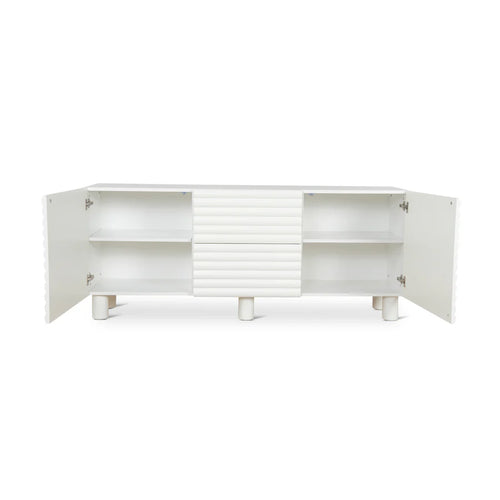 Angled view of Nezha Sideboard highlighting three ribbed doors, slim base, and spacious top surface