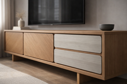 A handcrafted storage solution that combines clean lines with everyday function. The Casa TV Cabinet features two smooth-closing drawers stacked vertically on the right, and two hinged doors with internal shelving—ideal for hiding away remotes, media, and clutter. Designed at a comfortable 59 cm height, it works perfectly under wall-mounted TVs or as a standalone console. Built in the UAE from durable engineered wood and finished with a matte laminate, it brings warm, contemporary style into any room.