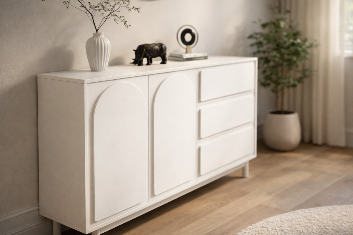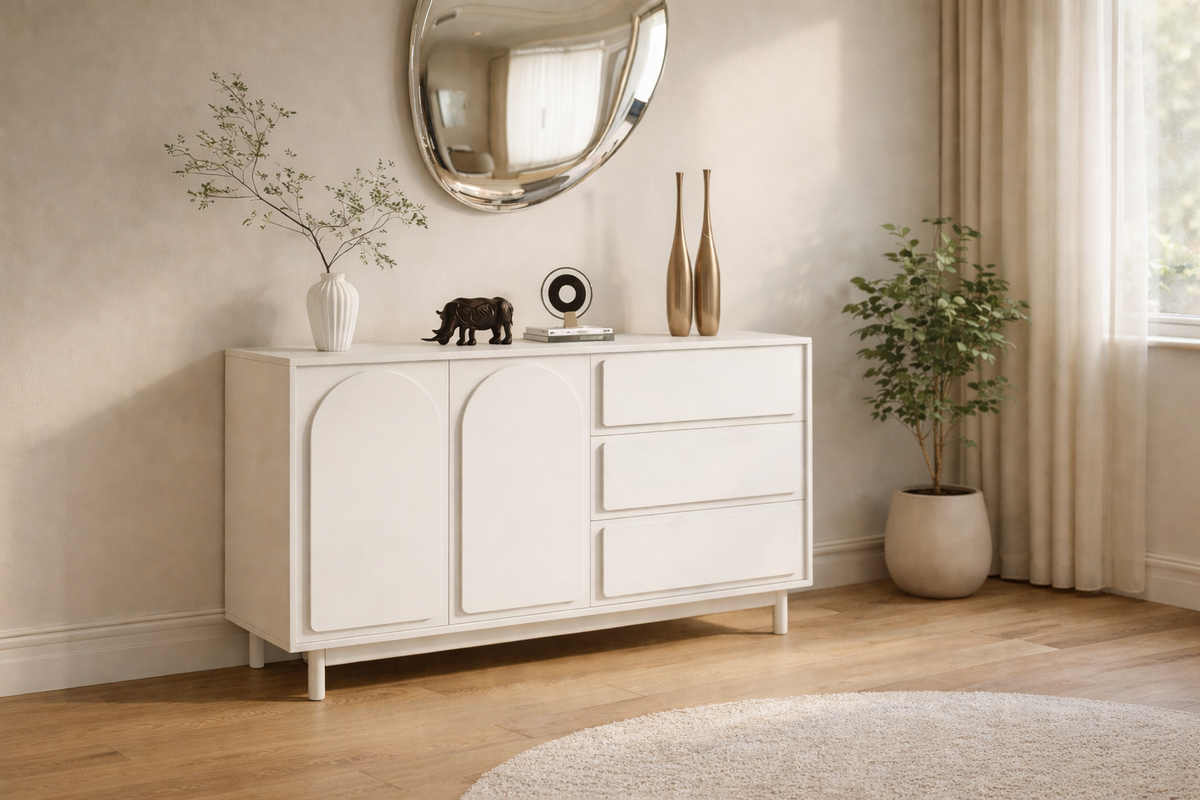 The Skuld Sideboard Cabinet offers a harmonious balance of style and functionality, crafted from premium engineered wood with solid wood legs for long-lasting durability. Its warm cream finish paired with wooden legs brings a touch of modern elegance to any room, while the compact size makes it perfect for smaller spaces or high-traffic areas.