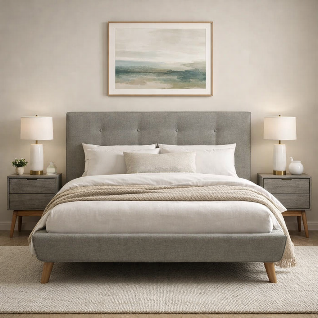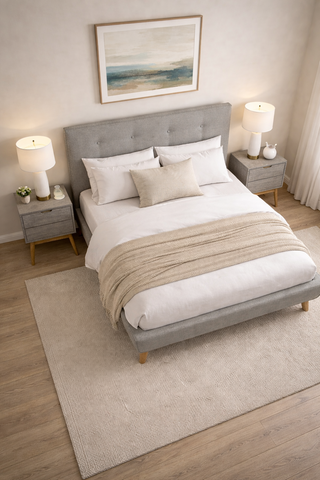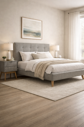 Enhance your bedroom with the modern and sophisticated Alana Upholstered Bed. With its elegant design and high-quality fabric, this bed is sure to elevate the style of your room. The sturdy frame and comfortable padding provide both durability and comfort, making it the perfect choice for a good night's sleep.