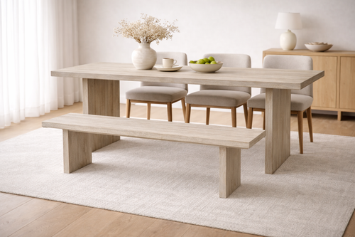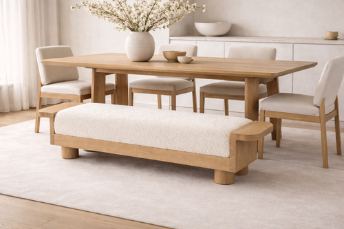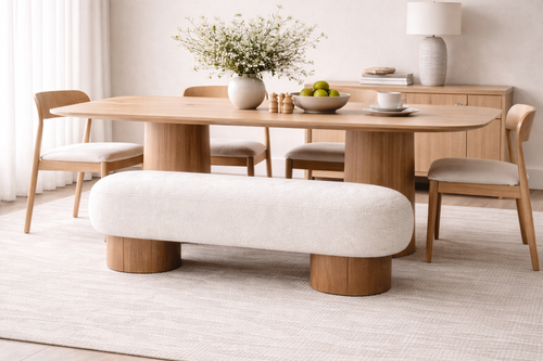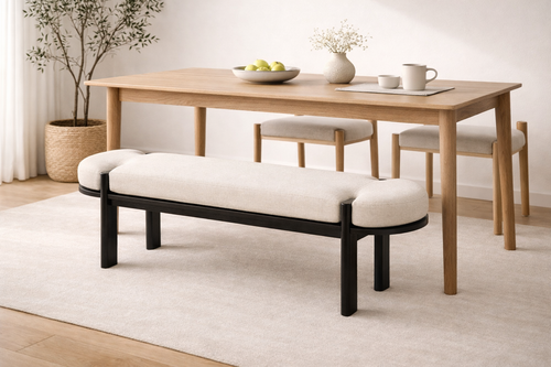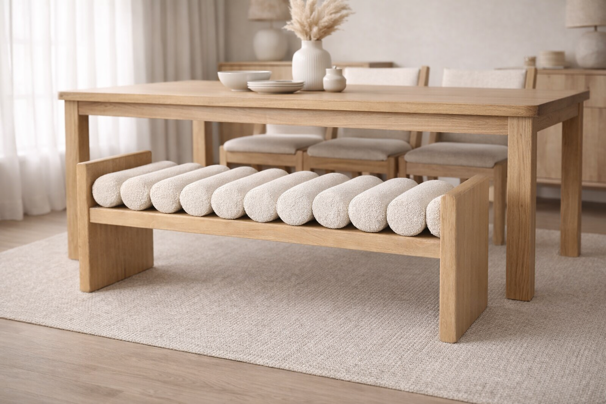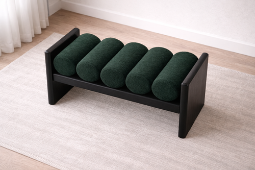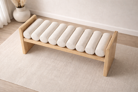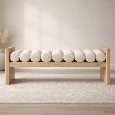 Enhance your living space with the distinctive Wave 2.0 bench from AL HAYAT Furniture. Skillfully crafted from solid wood, this bench exudes boldness and originality. Its innovative H-shaped design features nine plush boucle fabric cushion rolls atop, offering a cozy seating spot for you and your guests. With ample space to accommodate multiple individuals, it serves as a versatile seating solution while its contemporary flair effortlessly complements modern home decor.